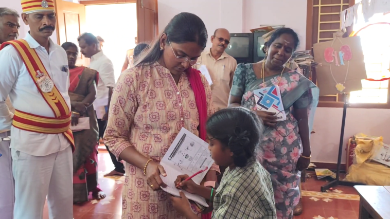 திருத்துறைப்பூண்டி அருகே அரசு பள்ளியில் ஆய்வு மேற்கொண்ட மாவட்ட ஆட்சியர் சாருஸ்ரீ அவர்கள் பள்ளி மாணவர்களுக்கு கணக்கு பாடம் சொல்லிக் கொடுத்தார்