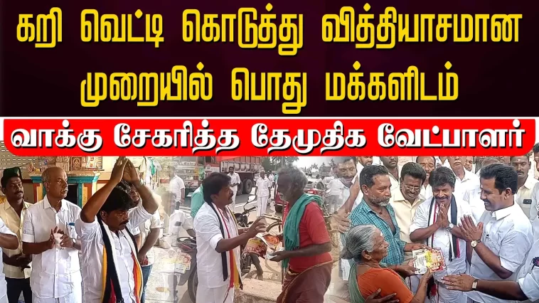 கசாப்பு கடையில் கறி வெட்டி கொடுத்து வித்தியாசமான முறையில் வாக்கு சேகரித்த தேமுதிக