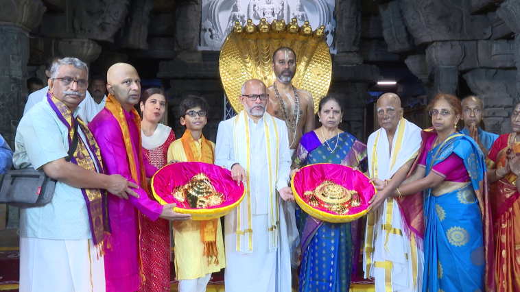 இன்று ஏழுமலையானை வழிபட்ட பின் அந்த நிறுவனத்தின் சார்பில் ஏழுமலையான் கோவிலில் உள்ள ரங்கநாயகர் மண்டபத்தில் தங்கத்தால் செய்யப்பட்ட சங்கு, சக்கரம் ஆகியவை தேவஸ்தான கூடுதல் நிர்வாக அதிகாரியிடம் ஒப்படைக்கப்பட்டன.