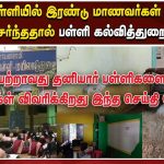 மயிலாடுதுறை மாவட்டத்தில் ஒற்றை இலக்கத்தில் சரிந்த அரசு பள்ளி மாணவர் சேர்க்கை, முன்னாள் கல்வி அமைச்சர் பயின்ற நகராட்சி அரசு பள்ளியில் இரண்டு மாணவர்கள் மட்டுமே புதிதாக சேர்ந்ததால் பள்ளி கல்வித்துறை அதிர்ச்சி, பள்ளிகளின் தரம் உயராத காரணத்தாலும், ஆசிரியர் கைகள் கட்டப்பட்டதாலும் கடன் பெற்றாவது தனியார் பள்ளிகளை நாடும் பொதுமக்கள் விவரிக்கிறது இந்த செய்தி தொகுப்பு.