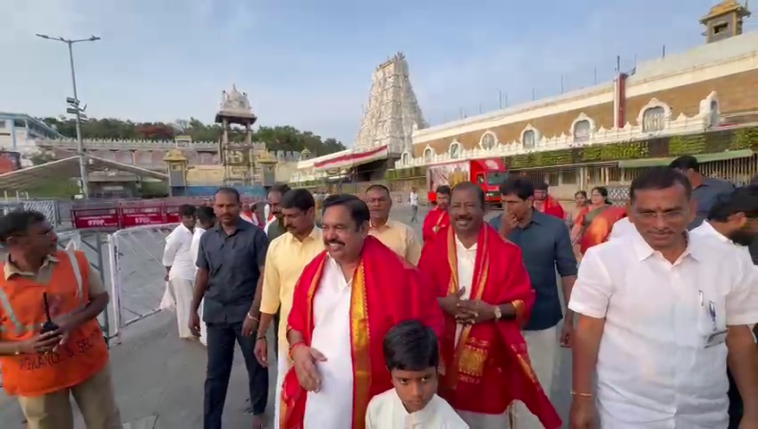 தமிழக சட்டமன்ற எதிர்க்கட்சித் தலைவர் எடப்பாடி பழனிசாமி ஏழுமலையான் வழிபாட்டிற்காக நேற்று மாலை திருப்பதி மலைக்கு வந்தார்.