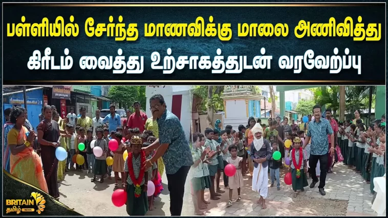 பள்ளியில் சேர்ந்த மாணவிக்கு மாலை அணிவித்து கிரீடம் வைத்து உற்சாகத்துடன் வரவேற்ப்பு