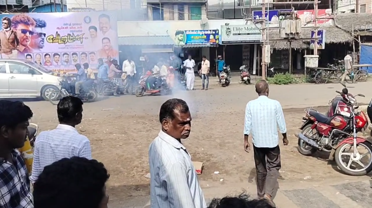மயிலாடுதுறையில் திரையிடப்பட்ட வேட்டையன் திரைபடத்திற்கு ரசிகர்கள் வெடி வெடித்து கொண்டாட் டம்