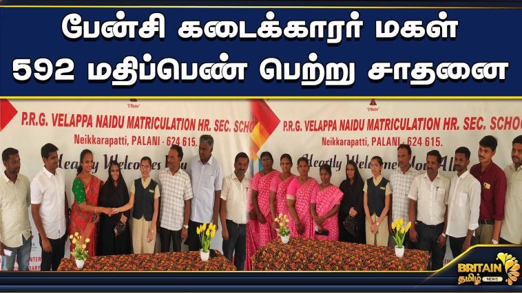 பழனியில் பேன்சி கடைக்காரர் மகள் 592 மதிப்பெண் பெற்று சாதனை. நான்கு படங்களில் நூற்றுக்கு நூறு மதிப்பெண் பெற்றுள்ளார்.