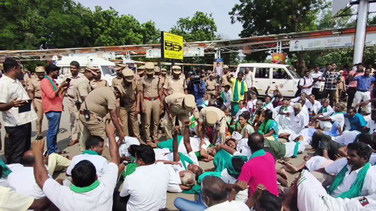 ஒரு கட்டத்தில் விவசாயிகள் தரையில் படுத்து போராட்டத்தில் ஈடுபட்டதால் காவல்துறை துணை ஆணையர் செல்வகுமார் தலைமையில் ஆய்வாளர்கள் அய்யாக்கண்ணு உள்ளிட்ட விவசாயிகளை குண்டுக்கட்டாக தூக்கி வேனில் ஏற்றி கைது செய்துள்ளனர். பெண்கள் உள்ளிட்ட நூற்றுக்கணக்கான விவசாயிகள் அருகில் உள்ள திருமண மண்டபத்தில் தங்க வைக்கப்பட்டுள்ளனர்.