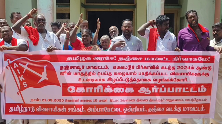 தஞ்சாவூர் மாவட்டம் மெலட்டூர் பிர்காவில் கடந்த 2024 ஆம் ஆண்டு பருவம் தவறி பெய்த கனமழையால் நூற்றுக்கணக்கான ஏக்கரில் விளைநிலங்கள் பாதிக்கப்பட்டன.