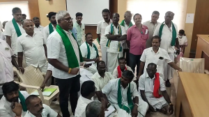 பின்னர் அதிகாரிகளின் பேச்சுவார்த்தைக்கு பின் போராட்டத்தை விலக்கி கொண்டனர் இதனால் மாவட்ட ஆட்சியர் அலுவலகத்தில் நடைபெற்ற விவசாயிகள் குறைகேட்பு கூட்டத்தில் சிறிது நேரம் பரப்பரப்பு ஏற்பட்டது