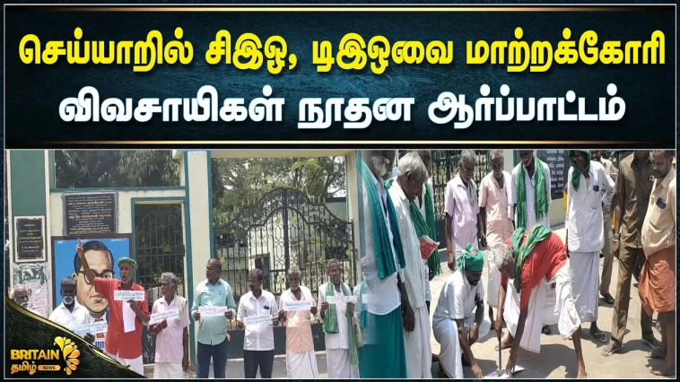 செய்யாறில் மாவட்ட கல்வி அலுவலகம் எதிரில் சிஇஓ, டிஇஒவை மாற்றக்கோரி விவசாயிகள் நூதன ஆர்ப்பாட்டத்தில் ஈடுபட்டனர்.
