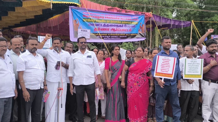 தஞ்சை பனகல் கட்டிடம் முன்பு வருவாய் துறை சங்கங்களின் கூட்டமைப்பு தற்செயல் விடுப்பு எடுத்து தர்ணா போராட்டம்.