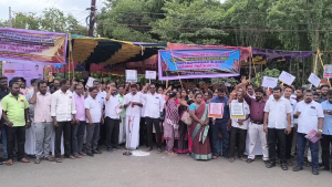 இதனை ரத்து செய்ய வேண்டும். உள்ளிட்ட கோரிக்கைகளை முன்வைத்து தஞ்சை பனகல் கட்டிடம் முன்பு தர்ணா போராட்டத்தில் ஈடுபட்டனர்.