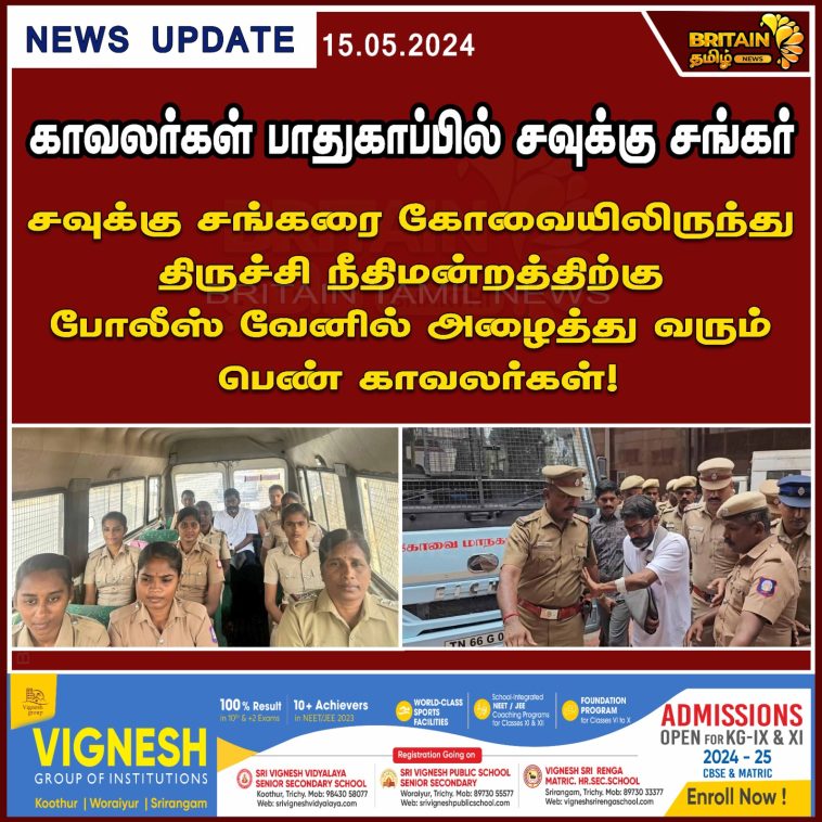 திருச்சி மாவட்ட கணினி சார் குற்றப்பிரிவில் ‘சவுக்கு’ சங்கர் மீது 5 சட்ட பிரிவுகளில் பதியப்பட்டுள்ள வழக்கிற்கு திருச்சி மகிளா உரிமையியல் நீதிமன்றத்திற்க்கு பலத்த போலீஸ் பாதுகாப்புடன் கோவை மத்திய சிறையில் இருந்து அழைத்து வரப்பட்டு ஆஜர்படுத்தபட்டார்.