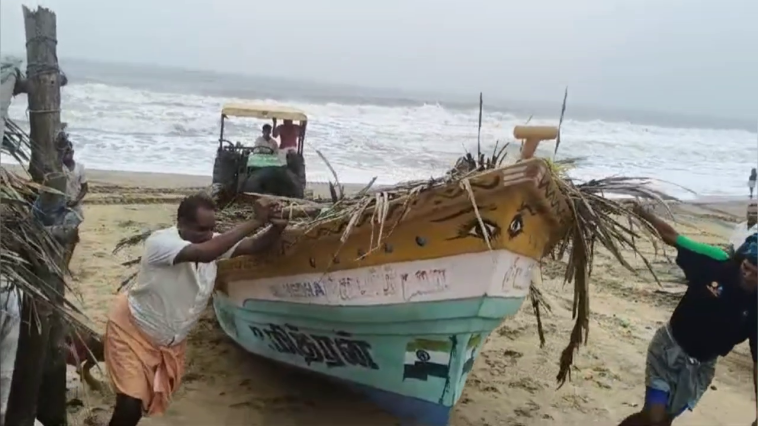 வங்கக் கடலில் ஏற்பட்டுள்ள புயல் சின்னம் காரணமாக டிராக்டர்கள் உதவி கொண்டு படகுகளை கரையேற்றும் மீனவர்கள்