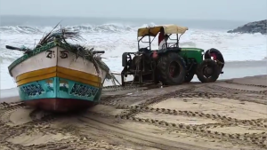 டிராக்டர்கள் உதவி கொண்டு படகுகளை கரையேற்றும் மீனவர்கள்