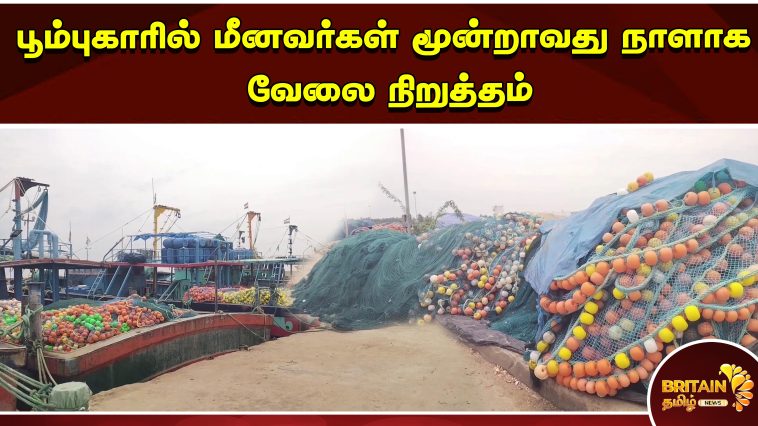 பூம்புகாரில் மீனவர்கள் மூன்றாவது நாளாக வேலைநிறுத்தம், கைது செய்யப்பட்ட மீனவர்கள் படகுடன் விடுவிக்கப்படும் வரை வேலை நிறுத்தம் தொடரும் என்று அறிவிப்பு.