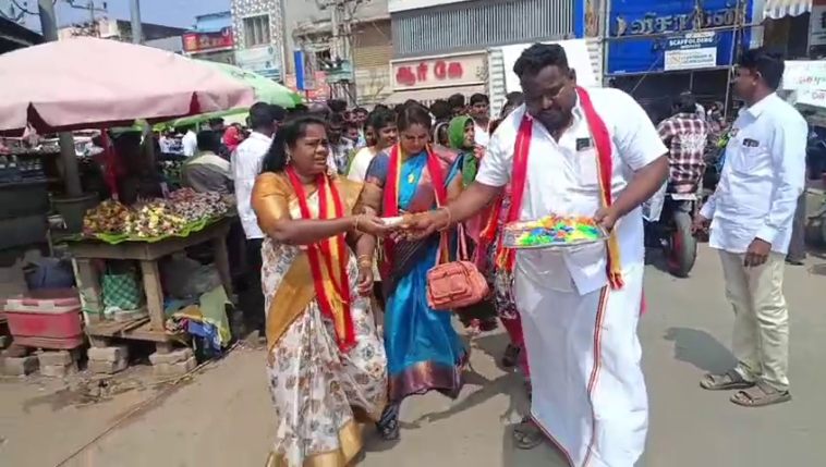 அதன் அடிப்படையில் இராமநாதபுரம் நகர் மத்திய பகுதியில் பகுதியில் நகர் செயலாளர் கே.கே.ராஜ்குமார் விஜய் ஏற்பாட்டில் கிழக்குமாவட்டத் தலைவர் மலர்விழி ஜெயபாலா அரண்மனை பகுதியில் வெடி வெடித்து காது கிழிய விசில் ஊதியப்படி அந்த பகுதியில் உள்ள வியாபாரிகள் மற்றும் பொதுமக்களுக்கு தமிழக வெற்றிக் கழகத்தின் சின்னமான விசிலை வழங்கியும் உடன் இனிப்புகளையும் வழங்கி வாக்கு சேகரிப்பில் ஈடுபட்டனர்.
