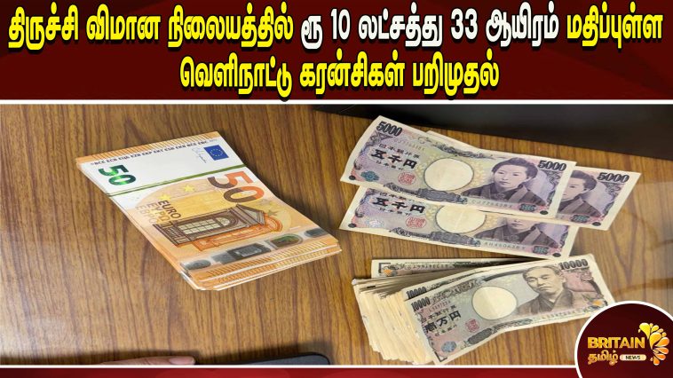 திருச்சி விமான நிலையத்தில் ரூ 10 லட்சத்து 33 ஆயிரம் மதிப்புள்ள வெளிநாட்டு கரன்சிகள் பறிமுதல்.