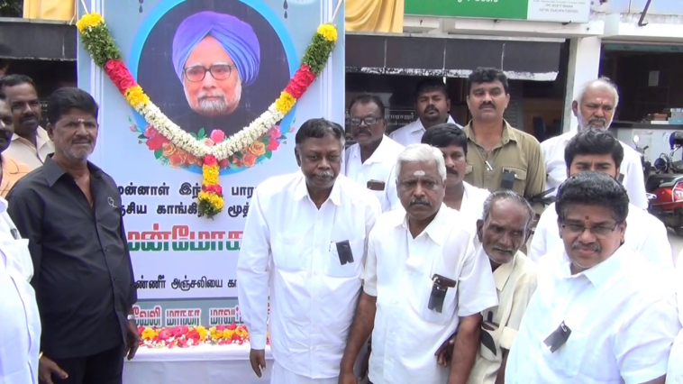 முன்னாள் பாரத பிரதமர் மன்மோகன் சிங் மறைவையொட்டி காங்கிரஸ் கட்சியினர் மலர் தூவி மரியாதை