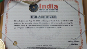 குழந்தை சியாவிற்கு இயல்பாகவே கற்றல்திறன் அதிகமாக இருப்பதாகவும் கூறுகின்றனர். மேலும் குழந்தை சியா இந்தியன் புக் ஆஃப் ரெக்கார்டு, ஒலிம்பியாட் நட்சத்திர திறமையாளர், ஓவியக்கலையில் மைசூர் அரசு விருது, 2024 அபாக்கஸ் சாம்பியன், மாநில அளவிலான சிலம்பத்தில் முதலிடம் என பல்வேறு சாதனைகளை குவித்துள்ளார்.