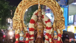பின்னர் மேளதாளங்கள் முழங்க உபயதாரர்கள், பக்தர்கள், தங்கத் தேரினை வடம் பிடித்து இழுத்துச் செல்ல காஞ்சி காமாட்சி அம்மன், கோவில் வளாகத்தில் உலா வந்து பக்தர்களுக்கு காட்சி அளித்தார்.