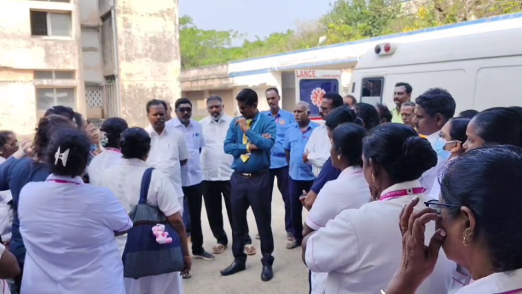 மருத்துவமனை நிர்வாகம் உடனடியாக அனைவருக்கும் பணியை பகிர்ந்து கொடுக்க வேண்டுமென 70-க்கும் மேற்பட்ட செவிலியர்கள் திடீரென மருத்துவ கண்காணிப்பாளர் அரையின் முன்பு தர்ணா போராட்டத்தில் ஈடுபட்டனர் இதனால் பரபரப்பு ஏற்பட்டது. போராட்டத்தில் ஈடுபட்ட செவிலியர்களிடம் மருத்துவமனை நிர்வாகம் தற்போது பேச்சுவார்த்தையில் ஈடுபட்ட வருகின்றனர்.