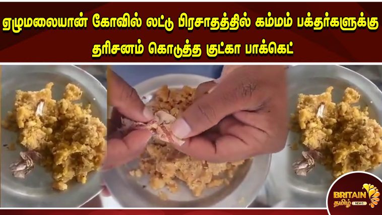 ஏழுமலையான் கோவில் லட்டு பிரசாதத்தில் கம்மம் பக்தர்களுக்கு தரிசனம் கொடுத்த குட்கா பாக்கெட்.