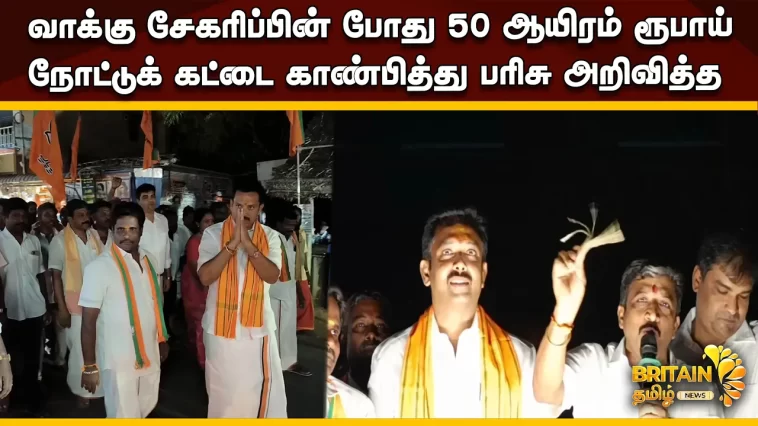 வேடசந்தூர் அருகே வாக்கு சேகரிப்பின் போது 50 ஆயிரம் ரூபாய் நோட்டுக் கட்டை காண்பித்து பரிசு அறிவித்த கரூர் பா.ஜ.க வேட்பாளர் செந்தில்நாதன் உள்ளிட்ட 5 பேர் மீது வடமதுரை போலீசார் வழக்குப்பதிவு