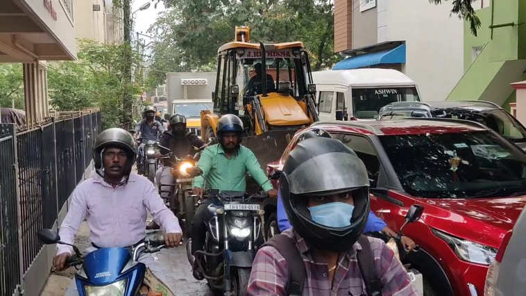 குறுகிய சாலையில் அதிகப்படியான வாகனங்கள் செல்வதால் வாகனங்கள் செல்ல முடியாத சூழலில் சிக்கி தவிக்கும் நிலை.
