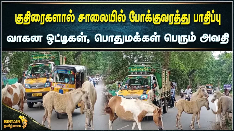குதிரைகளால் போக்குவரத்து பாதிப்பு வாகன ஓட்டிகள் மற்றும் பொதுமக்கள் அவதி