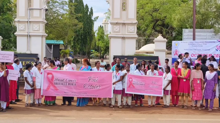 உலக மார்பக புற்றுநோய் தினத்தை முன்னிட்டு பாளையங்கோட்டையில் விழிப்புணர்வு மனித சங்கிலி நடைபெற்றது