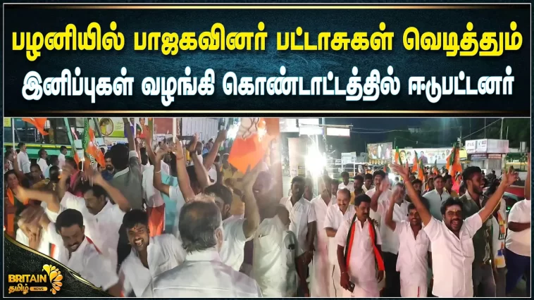 பழனியில் பாஜகவினர் பட்டாசுகள் வெடித்தும், இனிப்புகள் வழங்கியும் , மேளதாளம் இசைத்தும் நடனமாடியும் கொண்டாட்டத்தில் ஈடுபட்டு வருகின்றனர்.