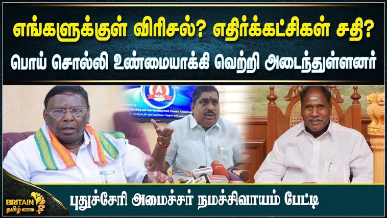 பாஜக -என். ஆர். காங்கிரஸ் கூட்டணியில் விரிசலை ஏற்படுத்தி அரசியல் செய்ய பார்க்கிறார்கள், தொடர்ந்து பொய் சொல்லி உண்மையாக்கி வெற்றி அடைந்துள்ளனர் என விமர்சனம்.