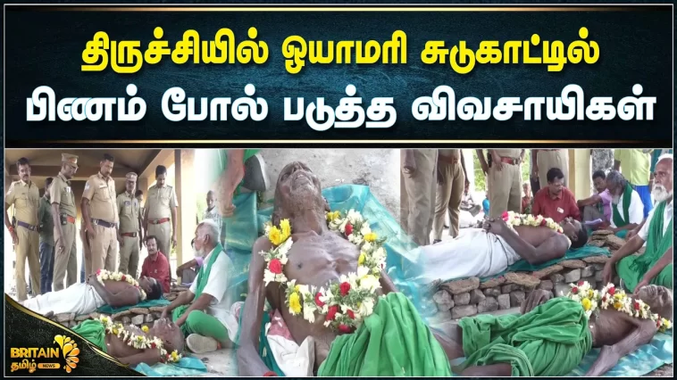 விவசாயிகள் திருச்சியில் ஓயாமரி சுடுகாட்டில் பிணம் போல் படுத்து போராட்டத்தில் ஈடுபட்டு வருகின்றனர்.