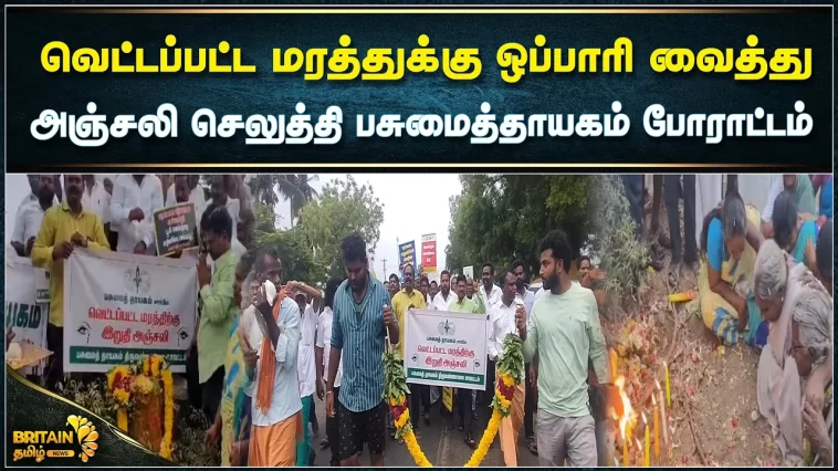 வந்தவாசியில், வெட்டப்பட்ட மரத்துக்கு அஞ்சலி செலுத்தி பசுமைத்தாயகம் போராட்டம்