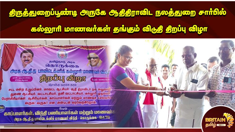 திருத்துறைப்பூண்டி அருகே அரசு பாலிடெக்னிக் கல்லூரி வளாகத்தில் புதிதாக கட்டப்பட்டு நீண்ட நாட்களாக திறக்கப்படாமல் இருந்த கட்டிடத்தில் ஆதிதிராவிட நலத்துறை சார்பில் கல்லூரி மாணவர்கள் தங்கும் விடுதி திறப்பு விழா மாணவர்கள் மகிழ்ச்சி.