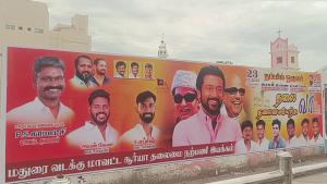 நம்மில் ஒருவர் நமக்கான ஒருவர் என்ற வாக்கியத்தில் அதிமுக, திமுக கட்சி கொடி வண்ணங்கள் இடம் பெற்றுள்ளது.
