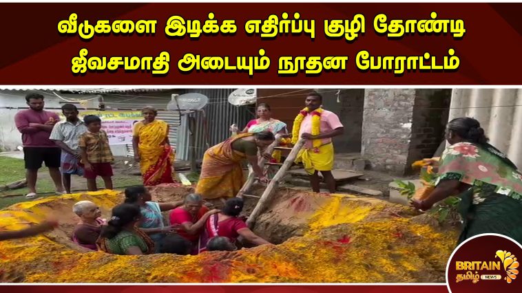 வீடுகளை இடிக்க எதிர்ப்பு குழி தோண்டி ஜீவசமாதி அடையும் நூதன போராட்டம்