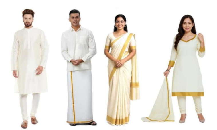 பெண்களுக்கான இந்திய பாரம்பரிய உடை என தங்க நிற பார்டருடன் கூடிய வெள்ளை நிற சேலையுடன் தங்க நிற ஜாக்கெட் அணிய வேண்டும். அல்லது தங்க நிற பார்டர் உடன் வெள்ளை நிற முழுக்கை சுடிதார் அல்லது சல்வார் காமீஸ் அணியலாம்.