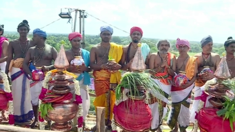 இன்று ஆறாவது கால யாகசாலை பூஜை பூர்ணாகுதியுடன் நிறைவு பெற்றதை தொடர்ந்து மங்கள வாத்தியங்கள் முழங்க புனித நீர் அடங்கிய கடன்கள் ஊர்வலமாக எடுத்து வரப்பட்டு கோபுர கலசங்களுக்கு புனித நீர் ஊற்றி கும்பாபிஷேகம் நடைபெற்றது.