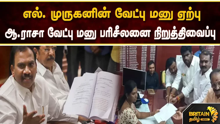 எல். முருகனின் வேட்பு மனு ஏற்புஆ.ராசா வேட்பு மனு பரிசீலனை நிறுத்திவைப்பு