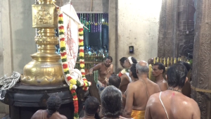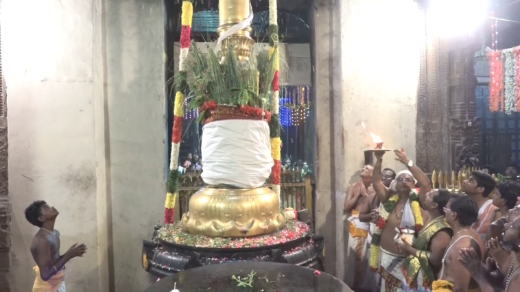 இதனை தொடர்ந்து தங்கக் கொடிமரத்தில் மங்கள வாத்தியங்கள், வேத மந்திரங்கள் முழங்கிட கருடாழ்வார் உருவம் பொறித்த கொடி கொடிமரத்தில் ஏற்றப்பட்டு சிறப்பு பூஜைகள் மற்றும் தீபாரதனை நடைபெற்றது.