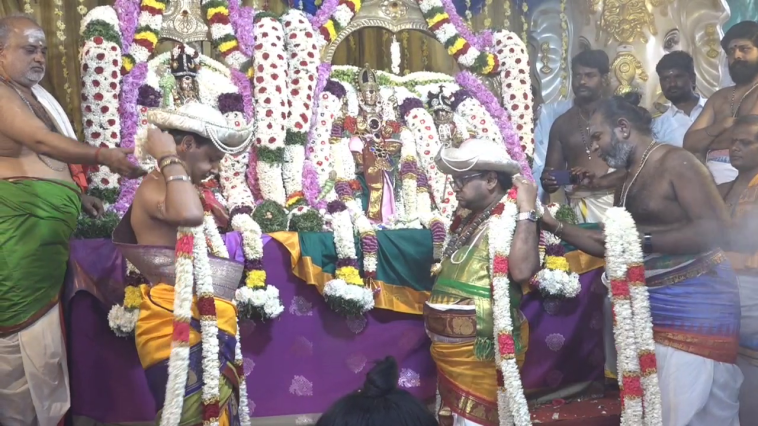 இதனையடுத்து சுவாமிகள் தினமும் பல்வேறு வாகனங்களில் எழுந்தருளி வீதியுலா வந்து பக்தர்களுக்கு அருள்பாலித்தார். இந்நிலையில் விழாவின் சிறப்பு பெற்ற நிகழ்ச்சிகளில் ஒன்றான திருக்கல்யாண வைபவம் இன்று கோவில் மண்டபத்தில் வெகு விமர்சையாக நடைபெற்றது .