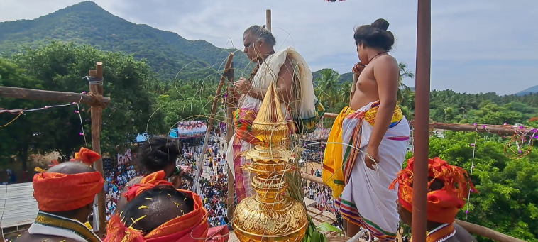 இந்த கும்பாபிஷேகத்திற்காக காசி, ராமேஸ்வரம், மலைக்கேணி, திருச்செந்தூர், திருப்பரங்குன்றம், கொடுமுடி உள்ளிட்ட பல்வேறு புனித ஸ்தலங்களில் இருந்து கொண்டு வரப்பட்ட புண்ணிய நீரை யாகசாலையில் வைத்து நான்கு கால யாகசாலை பூஜை வேத மந்திரங்கள் முழங்க வேள்விகள் வளர்க்கப்பட்டு பின்பு புனித நீரை கோவிலில் சுற்றி வலம் வந்த பின்பு கோபுர உச்சிக்கு கொண்டு செல்லப்பட்டு சிவாச்சாரியார்கள் வேத மந்திரங்கள் முழங்க புனித நீர் கலசத்தில் ஊற்றப்பட்டது.