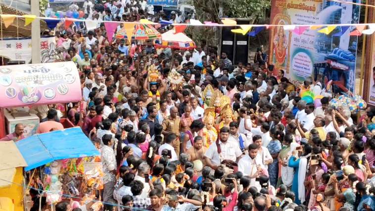 மேலும் பொதுமக்கள் மீது புனித நீர் ட்ரோன் மூலம் தெளிக்கபட்டது. இதில் திரளான பக்தர்கள் பங்கேற்று சாமி தரிசனம் செய்தனர். பின்னர் பக்தர்களுக்கு கோவில் பிரசாதமும் அன்னதானமும் வழங்கப்பட்டது.