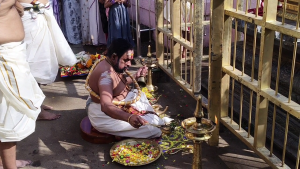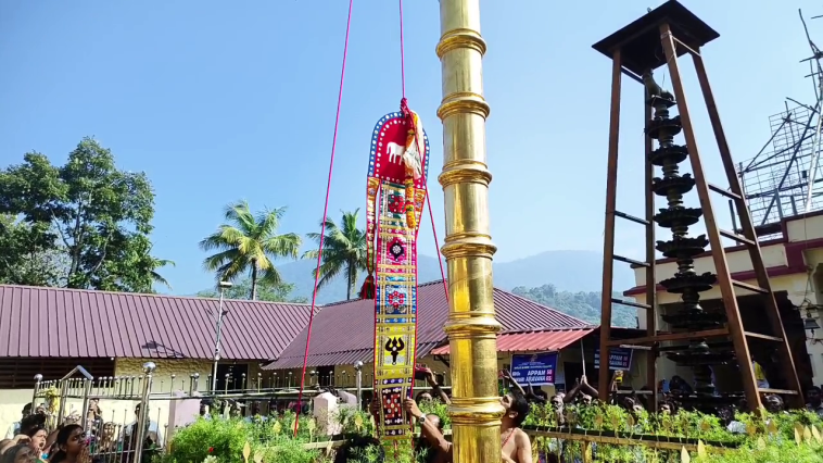 தொடர்ந்து நேற்று காலை 9. 30மணிக்கு தங்க கொடி மரத்தில் கொடி ஏற்றப்பட்டது. சபரிமலை முன்னாள் தந்திரி கண்டரரு மோகனரு தலைமையில் அர்ச்சகர்கள் கொடியை ஏற்றினார்கள். பின்னர் சிறப்பு பூஜைகள் மற்றும் தீபாராதனை நடைபெற்றது. நாராயண பாராயணம் நடைபெற்றது.