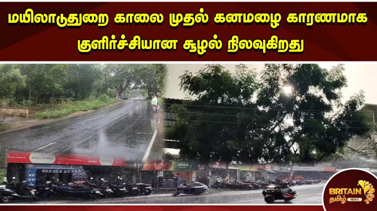 மயிலாடுதுறை காலை முதல் கனமழை காரணமாக குளிர்ச்சியான சூழல் நிலவுகிறது