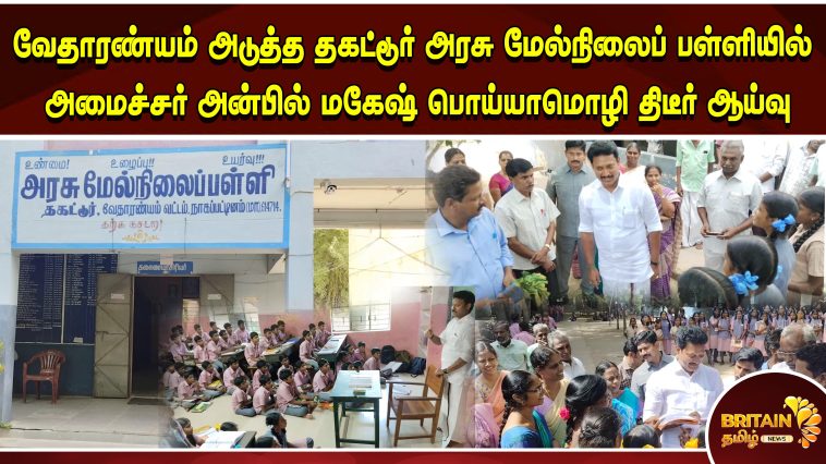 வேதாரண்யம் அடுத்த தகட்டூர் அரசு மேல்நிலைப் பள்ளியில் அமைச்சர் அன்பில் மகேஷ் பொய்யாமொழி திடீர் ஆய்வு