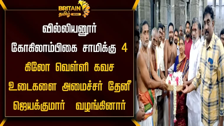 வில்லியனூர் கோகிலாம்பிகை சாமிக்கு வேளாண்துறை அமைச்சர் தேனீ ஜெயக்குமார் 4 கிலோ வெள்ளி கவச உடைகளை கோயில் நிர்வாகத்திடம் வழங்கினார்.