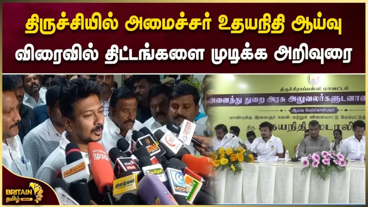 திருச்சி மாவட்ட ஆட்சியர் அலுவலகத்தில் உள்ள கூட்ட அரங்கில் அமைச்சர்கள் உதயநிதி, நேரு மகேஸ் மாவட்ட ஆட்சியர் பிரதீப் குமார் மற்றும் அனைத்து துறை அலுவலர்களுடன் ஆய்வு கூட்டம் நடைபெற்றது. இக்கூட்டத்தில் திருச்சி மாவட்டத்தில் தற்போது நடைபெற்று வரும் அரசின் பல்வேறு நலத்திட்டங்களை குறித்து ஆலோசனை கொடுக்கப்பட்டது விரைவில் திட்டங்களை முடித்து மக்கள் பயன்பாட்டுக்கு கொண்டுவர அறிவுறுத்தப்பட்டது