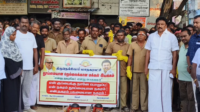 திருநெல்வேலி மாநகராட்சியின் தாரக மந்திரமான தூய்மையான நெல்லைக்கான மக்கள் இயக்கம் சார்பில் மெகா கூட்டு துப்புரவு பணி மேலப்பாளையம் மண்டலத்தில் சந்தை ரவுண்டானா அருகில் வைத்து இன்று காலை துவங்கியது