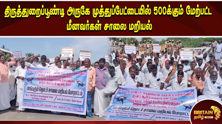 திருத்துறைப்பூண்டி அருகே முத்துப்பேட்டையில் 500க்கும் மேற்பட்ட மீனவர்கள் சாலை மறியல் போராட்டத்தால் பரபரப்பு போக்குவரத்து பாதிப்பு